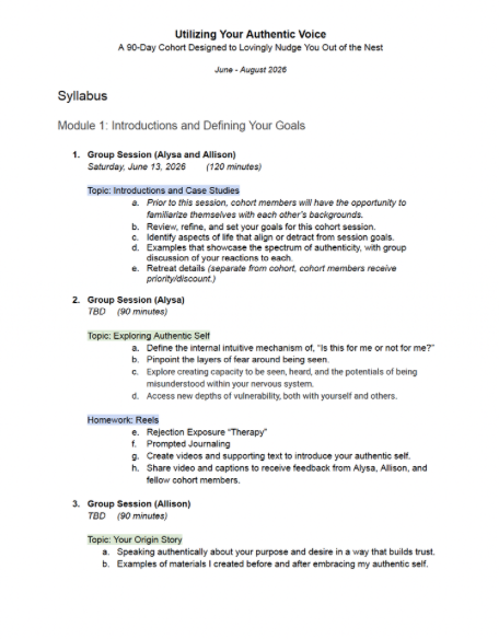 “Utilizing Your Authentic Voice” is a 90-day digital cohort co-facilitated by Alysa Conger and Allison Peterson. We have created this experience for those who want to invigorate their own authenticity as they step into the next phase of their personal and/or professional growth.